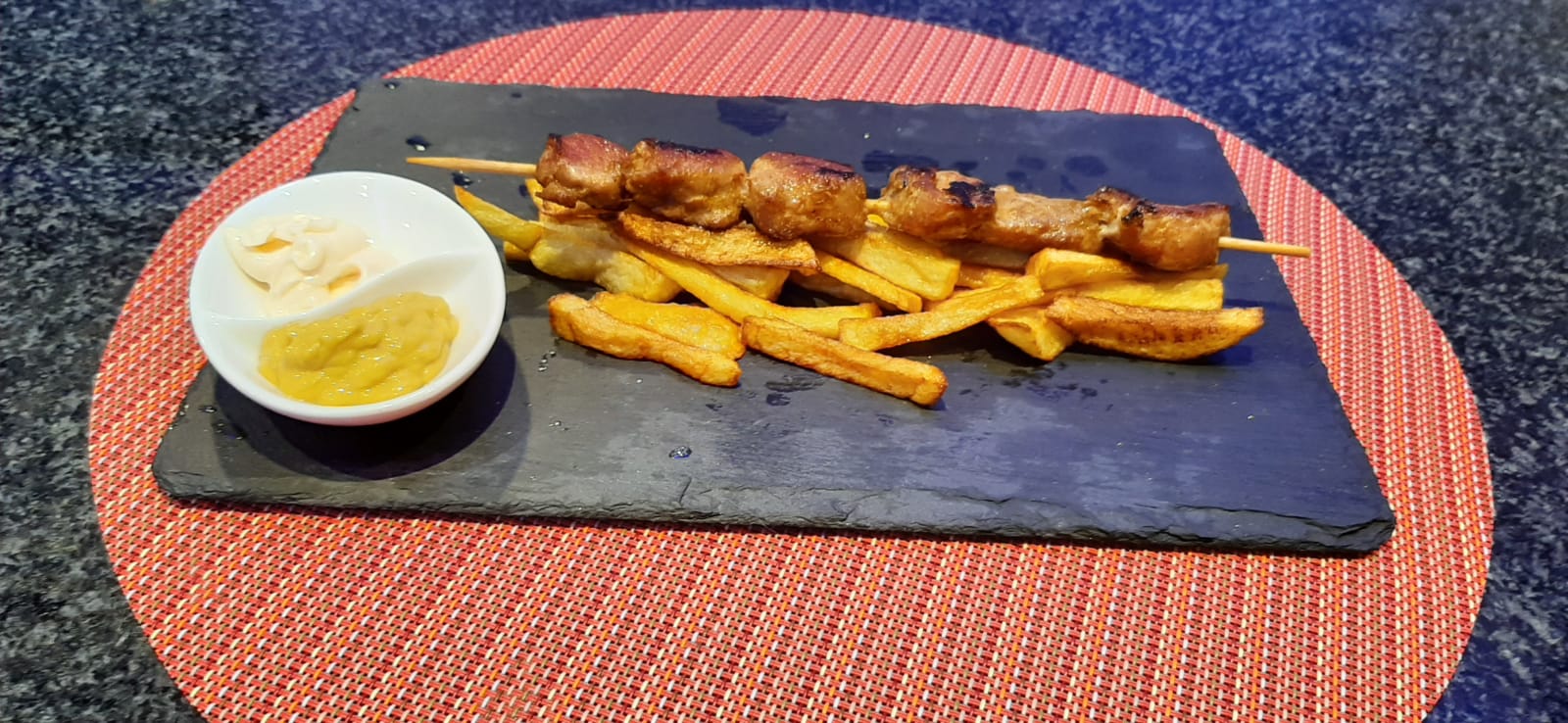 Verduras a la plancha, solomoillo de cerdo y patatas fritas