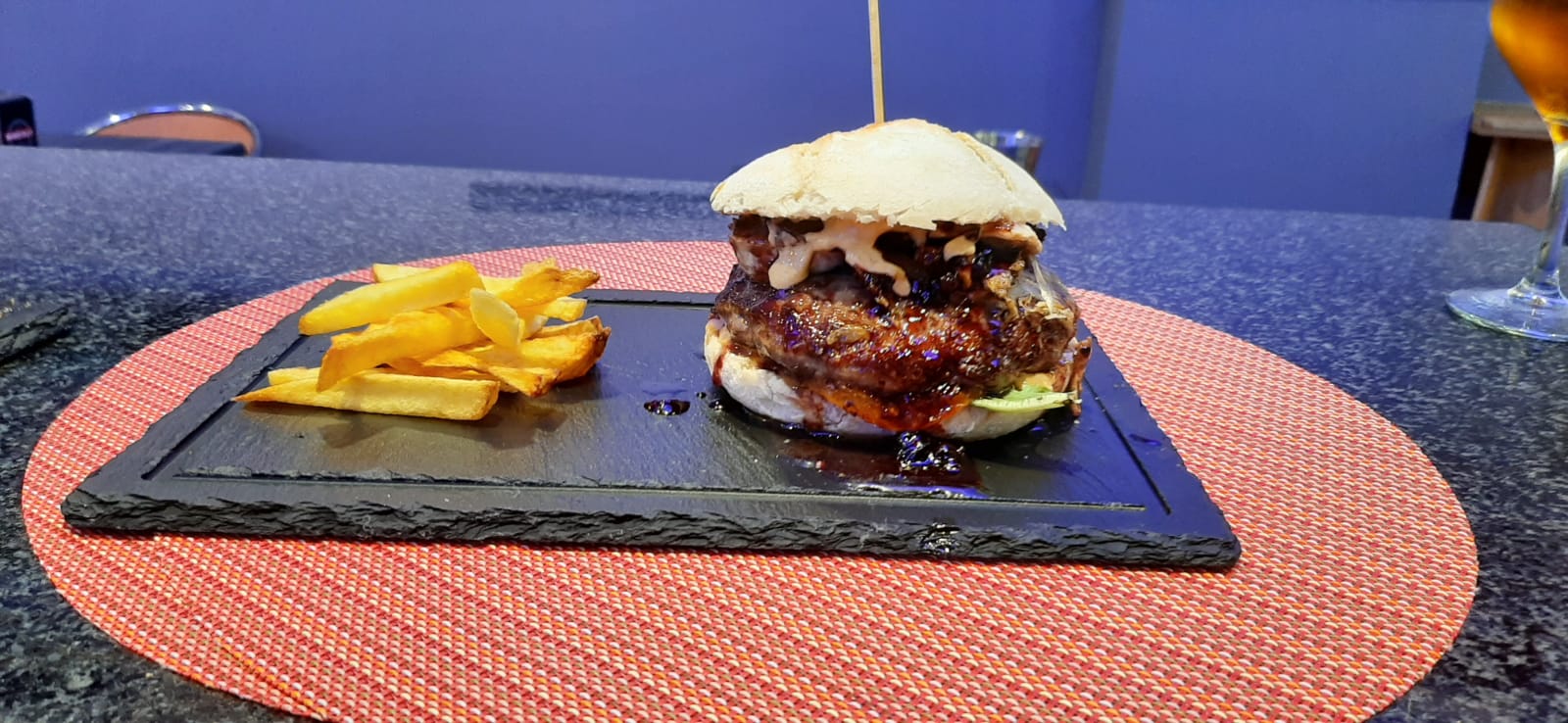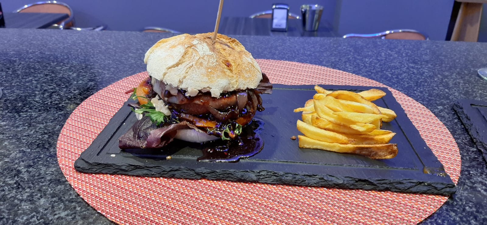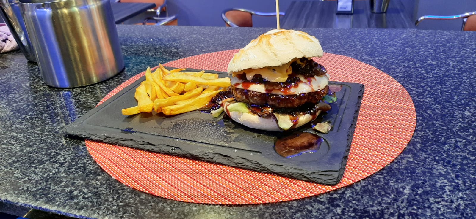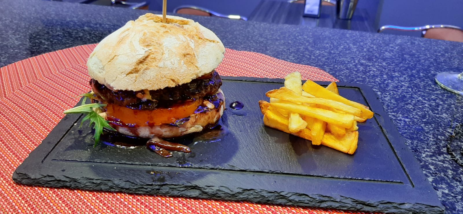 Lechuga, tomate, cebolla caramelizada, salsa burger y frutos rojos (opción pan sin gluten + 0,50€)